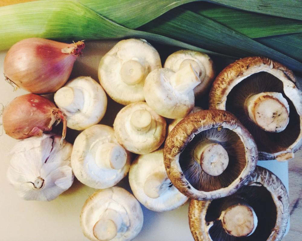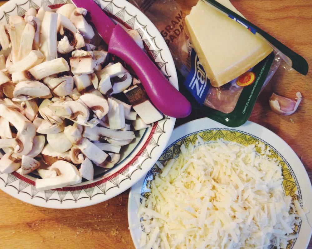 You'll need lots of mushrooms (I used about 25 regular mushrooms and 3 portabello mushrooms), two big cloves of garlic, two large shallots and half a leek. You will also need a couple of decilitres of cream, some white wine, chicken broth (or vegetable broth if you prefer that), some grated parmesan, nutmeg, salt and pepper.