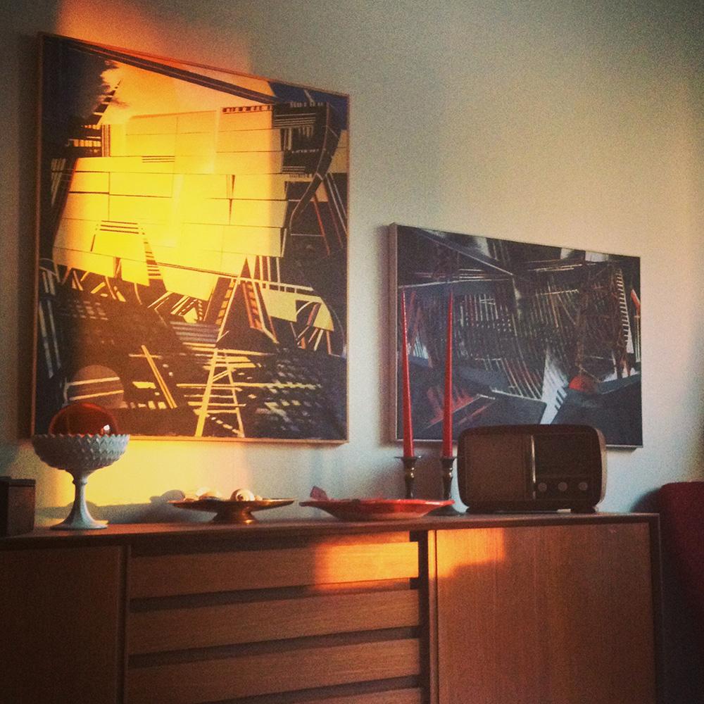 One evening the sun sent it's rays through our livingroom and landed on the paintings made by my grandfather.