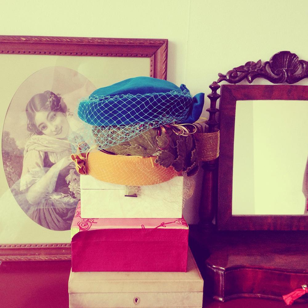 Bedroom detail: Hats, jewelry boxes, "Lady with grapes" (I inherited it from my grandmother when she died a long time ago. It used to hang over her bed and I loved it when I was a little girl. I thought the grape lady was so sweet and even though I know it's not worth anything money wise I still love it. And she is one pretty grape lady, can't really argue with that.)