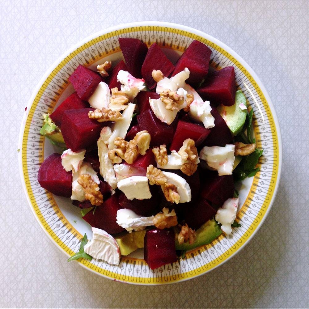 Lunch: Ruccola, avocado, beet roots, goat cheese, walnuts. (salt and pepper)