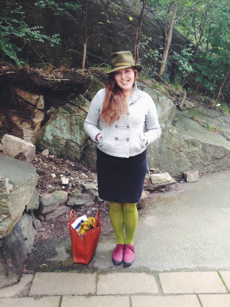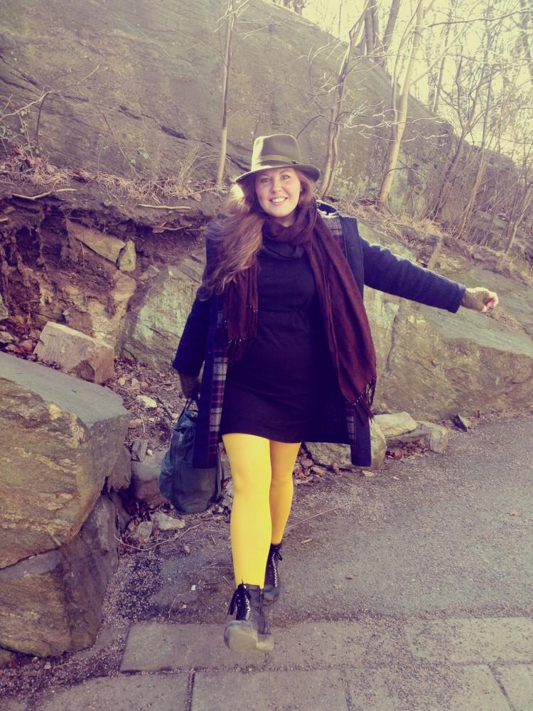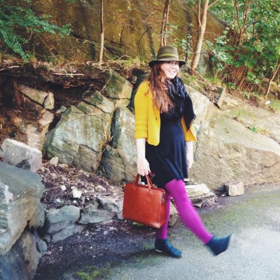 So a pair of wine red tights go well with mustard coloured socks. Then I can add a scarf or a ribbon in wine red to my hair and then something that picks up on the mustard too. A belt maybe?