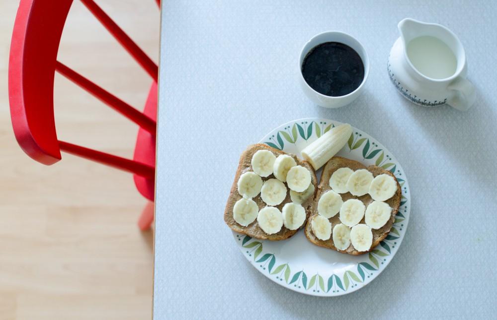 Toast with tahini (It needs to be of the organic brand Monki because there is just non like it. Tastes like peanut butter!) and banana. And coffee with milk in a pitcher.